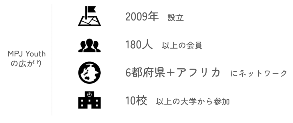 MPJ Youthは、「アフリカを学び、発信する」をコンセプトに、NPO法人ミレニアム・プロミス・ジャパン(MPJ)(現在はSDGs Promise Japan)の活動に賛同する学生たちによってに立ち上げられた団体です。MPJ Youthは2009年の設立以来、15周年を迎えます。